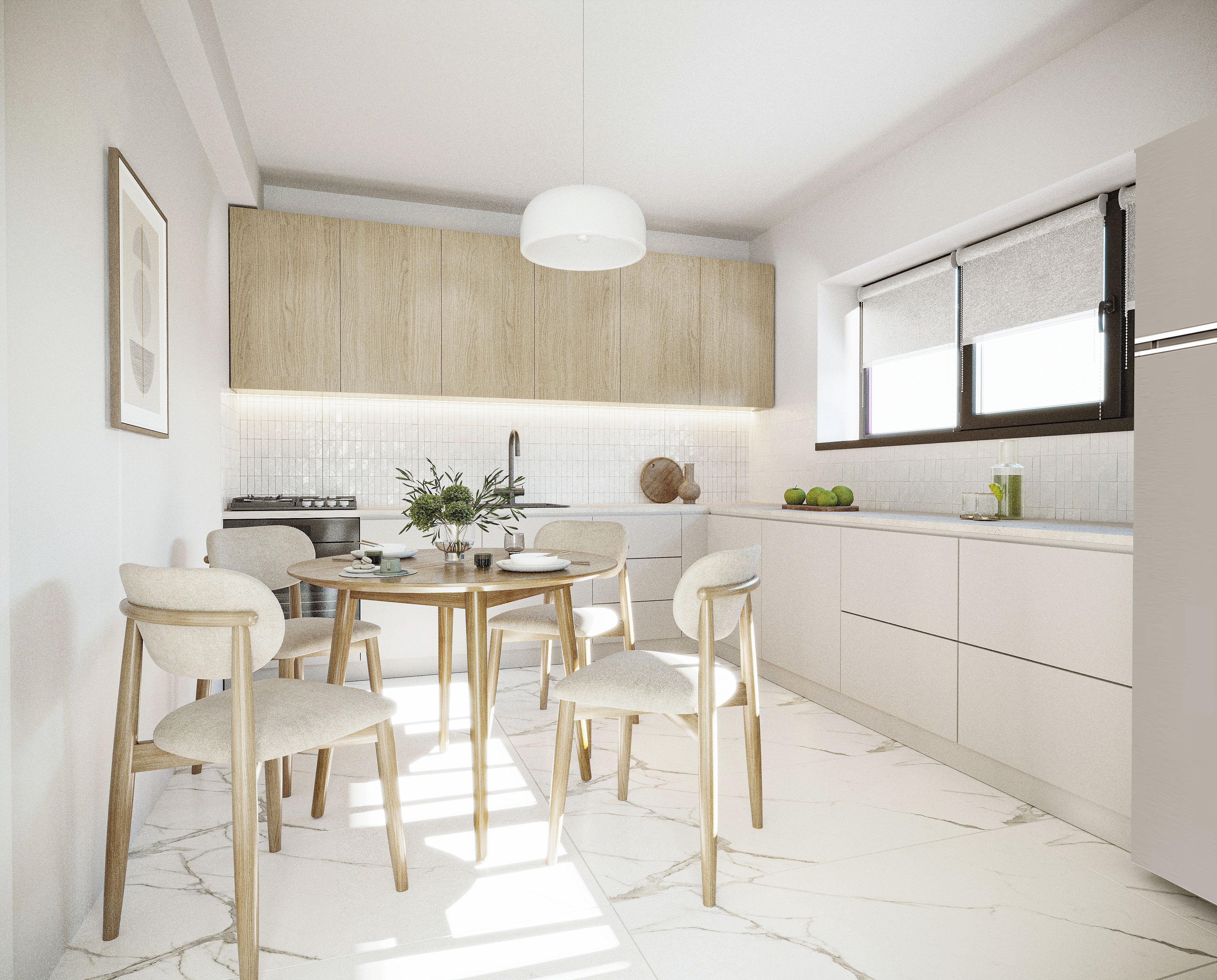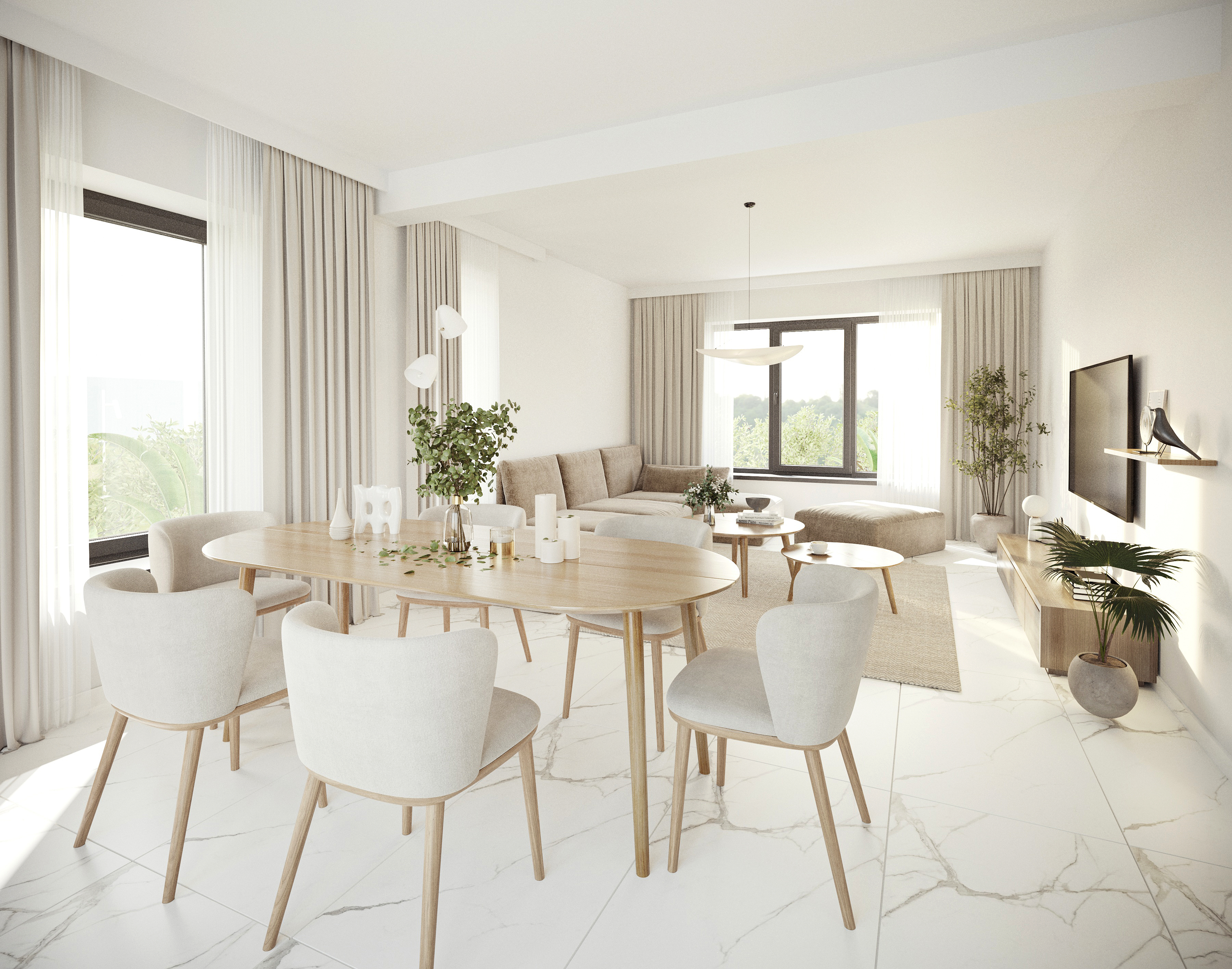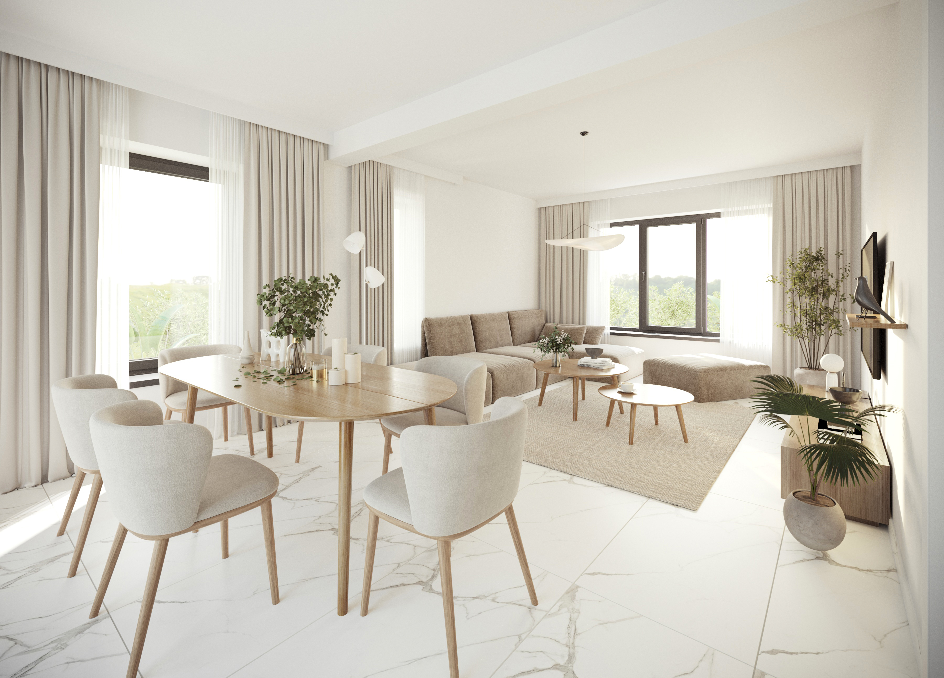 This project reflects a calm and balanced interior approach, combining minimalism with a subtle sense of elegance. The design works with the developer-provided finishes, integrating them cohesively into the overall concept. Existing marble flooring becomes a defining element, adding refinement and contrast to the warm, natural palette.
